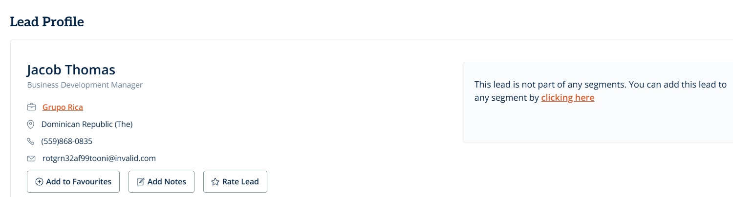 - If they are not part of an existing segment, at the top of the page, you'll see: “This lead is not part of any segments. You can add this lead to any segment by clicking here”