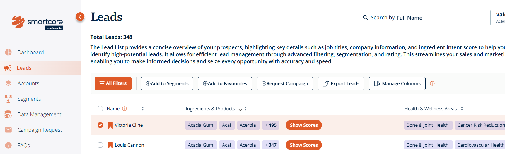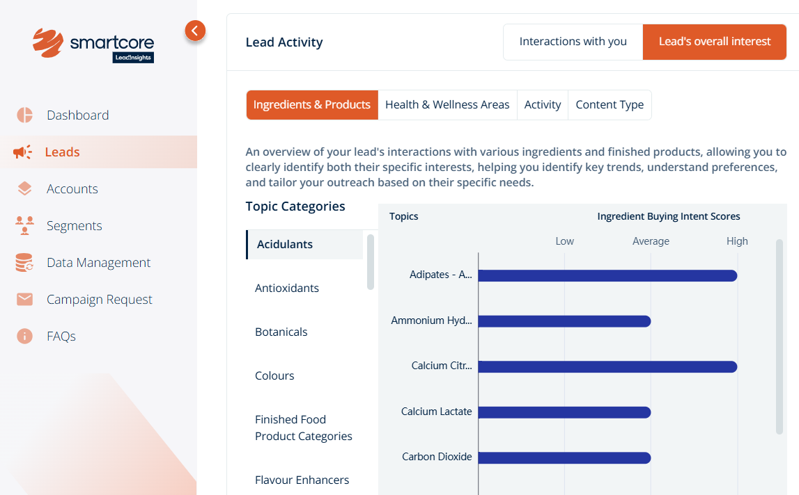 Action: Go to the Leads tab -> Select a lead to view their Topic of Interest insights -> Review ingredients or products your lead is interested in. You can also see which Health and Wellness Areas are relevant for them.